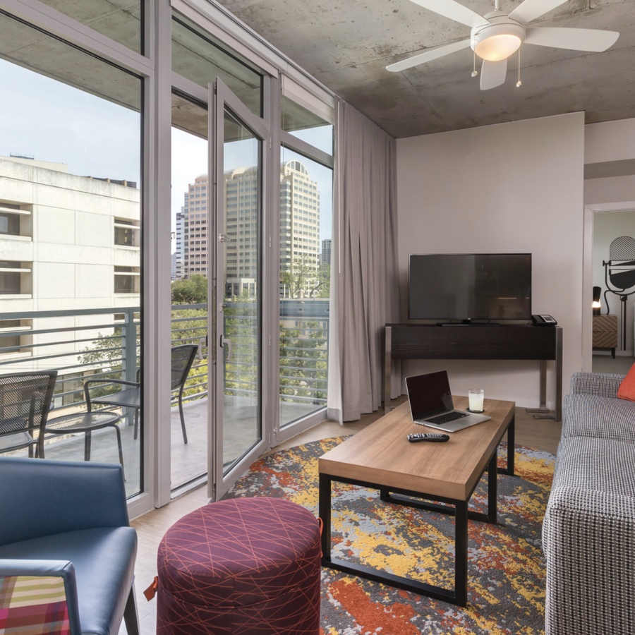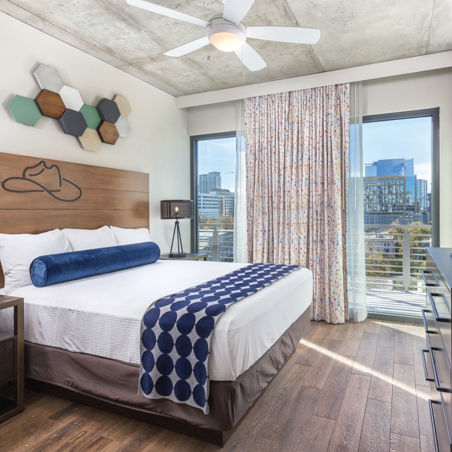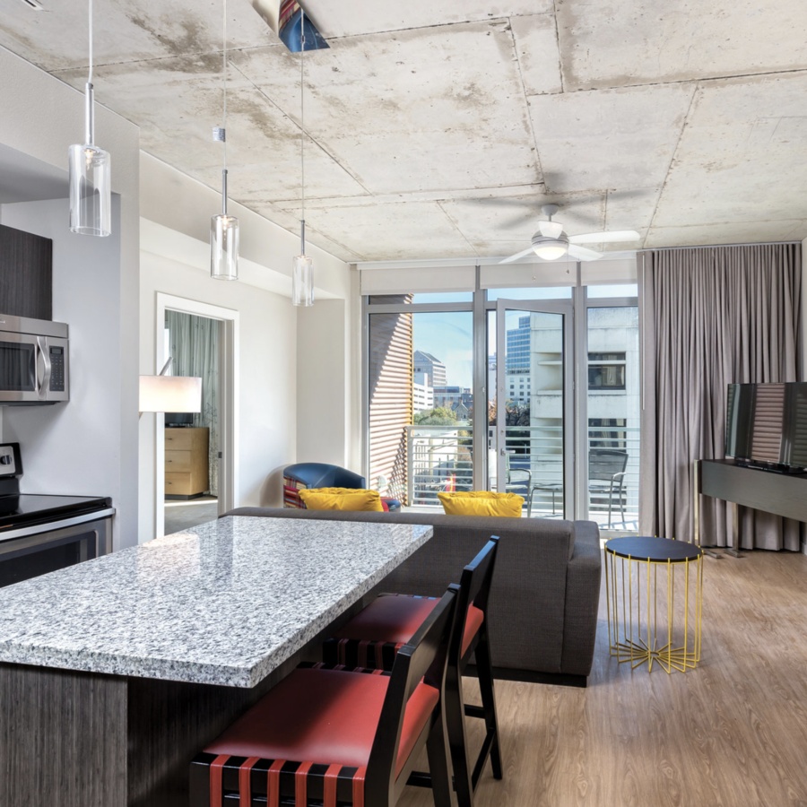 The Studio Deluxe Suite features a king-size bed in the primary bedroom, a queen-size sleeper sofa in the living area, and one full bathroom. The full-size kitchen includes coffee and tea maker, microwave, refrigerator, oven, stove, toaster, cookware, and flatware. General room amenities include cable TV, DVD player, hairdryer, iron and ironing board and WiFi. *NOT ALL STUDIO DELUXE SUITES PROVIDE A BALCONY.* Specific requests can be made by calling the resort ~1 week prior to check-in. 875 max sq. ft. Can sleep up to 4 guests comfortably.