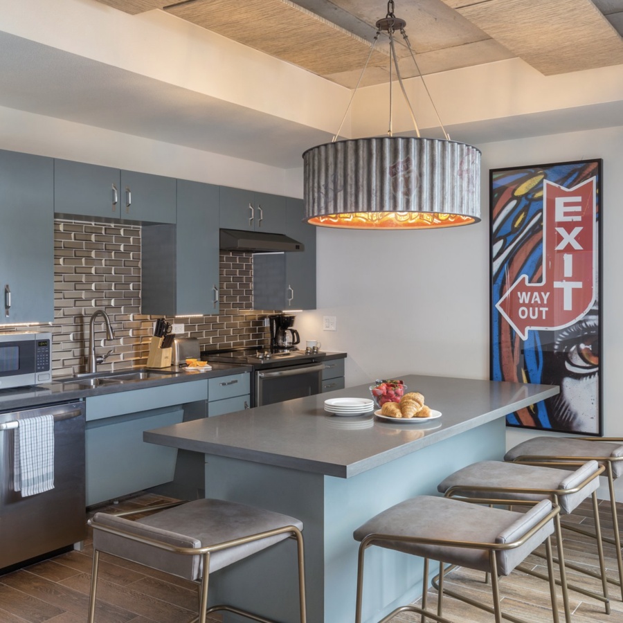 The 1 Bedroom Deluxe Suite features a king-size bed in the primary bedroom, a queen-size sleeper sofa in the living area, and one full bathroom. The full-size kitchen includes coffee and tea maker, microwave, refrigerator, oven, stove, toaster, cookware, and flatware.